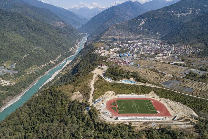 墨脱县的11人制足球场位于雅鲁藏布江边(2021年2月13日摄,无人机照片)。新华社记者 孙非 摄民族传统体育也在新时代焕发生机