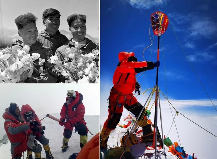 拼版照片:左上图为1960年5月登上珠穆朗玛峰峰顶的中国登山队队员王富洲(右)、贡布(中)和屈银华(资料照片,新华社发);左下图为2008年5月8日,北京奥运圣火珠峰传递登山队队员罗布占堆(左)点燃第一棒火炬手吉吉手中的“祥云”火炬(新华社发);右图为2020珠峰高程测量登山队队员在珠穆朗玛峰峰顶开展测量工作(2020年5月27日,新华社特约记者 扎西次仁 摄)