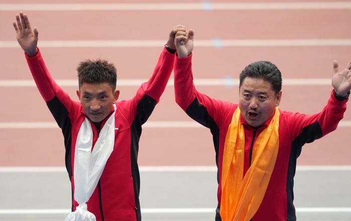 2021年9月23日,西藏队选手多布杰(左)在第十四届全运会田径项目上,以13分49秒16的成绩夺得男子5000米冠军。图为他和教练员在颁奖仪式上。新华社记者 李一博 摄